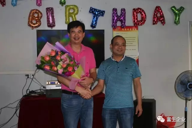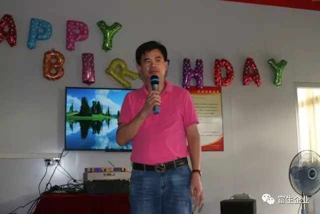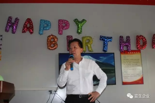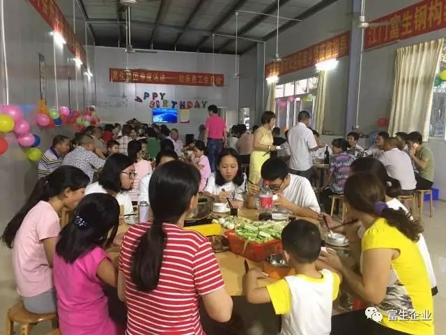 2017年7月12日下午17:30,富生集团第三季度员工生日会在公司食堂举办。由富生集体员工以及荣幸邀请到的江门市福建商会开平分会乡贤、部分阙氏宗亲代表,香港蓝海洋策略有限公司魏总一行,以及富生集团项目部的同事一同参加了此次活动。