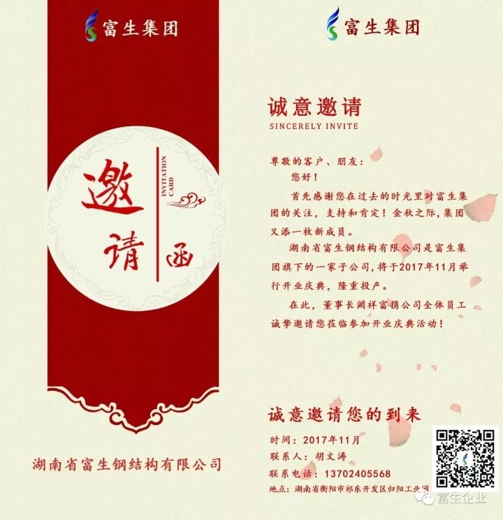 诚邀各位嘉宾,客户,朋友莅临湖南省富生钢结构有限公司开业庆典!