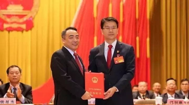 市委书记庞正华为新当选的市长邝积康颁发当选证书