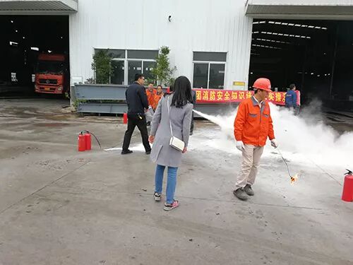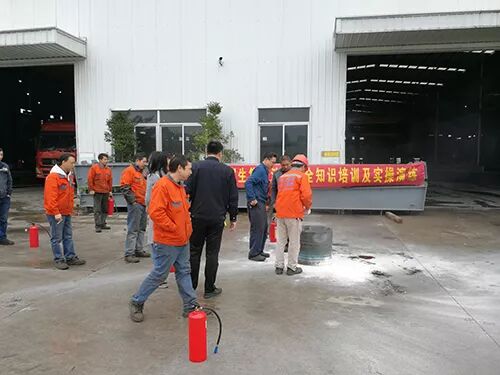 接下来11:40,理论知识讲解完毕后,集团全体员工集中到车间门口,梁教官现场对干粉灭火器的机构进行讲解,使用方法进行指导。让员工使用干粉灭火器对现场小型模拟火点进行灭火,亲身感受在火场应该如何使用正确消防设备。