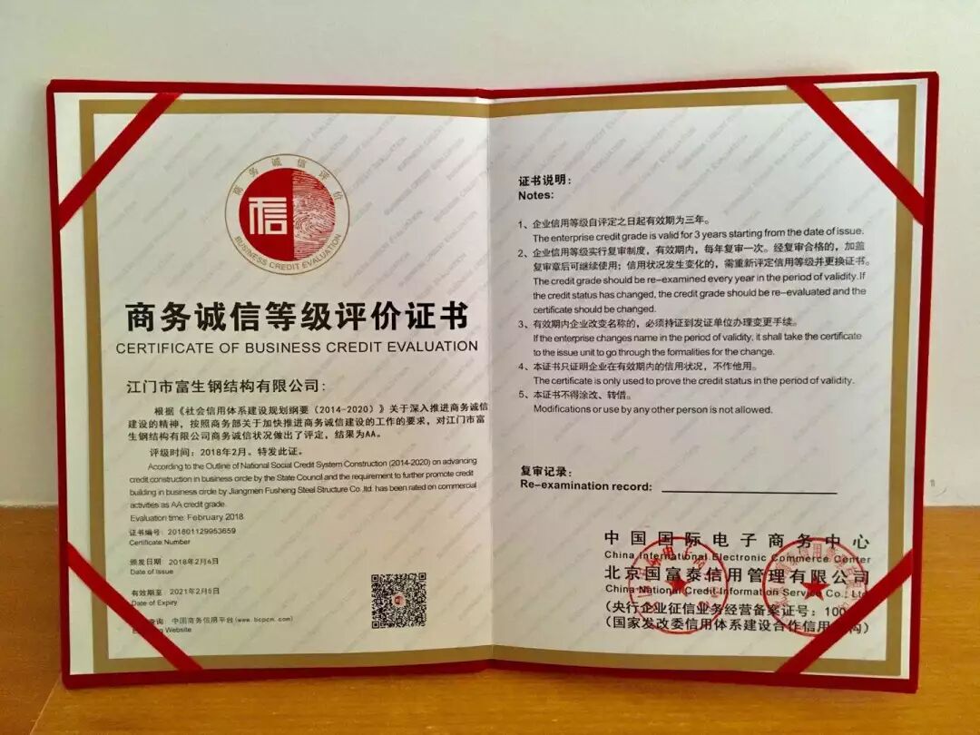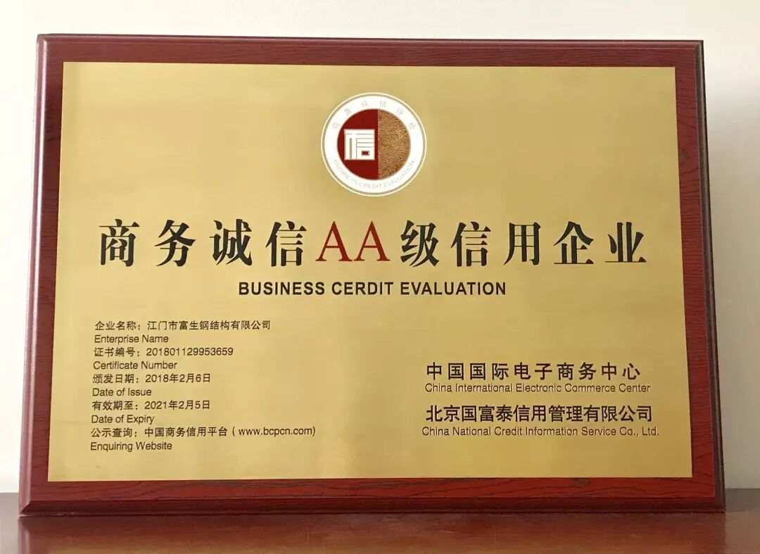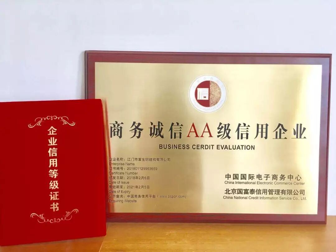 继广东富生建设有限公司获得信用2A评级后,这是富生集团的又一项荣誉,是对江门市富生钢结构有限公司自2015年投产以来恪守信用的肯定,是我们诚信经营的又一佐证。