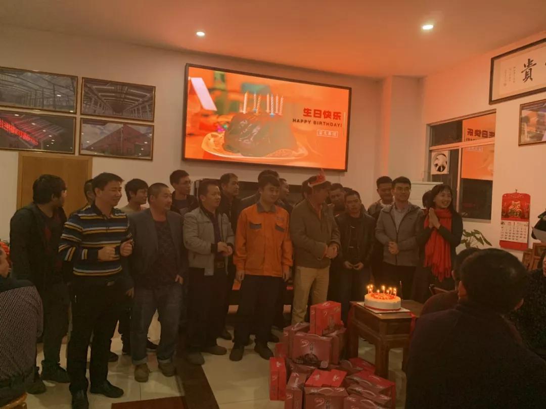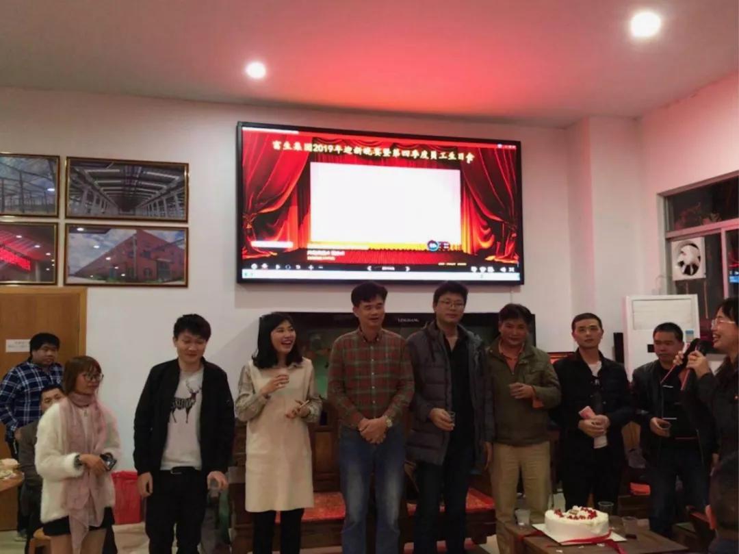晚会接下来便是最亲切温馨的时刻。在这样重要的日子里,恰巧迎来了公司第四季度的员工生日会。公司为22位寿星精心准备了生日礼物和蛋糕,我们富生钢构的总经理黄汉春先生也作为寿星代表发表了生日感言并为寿星们送上了生日祝福。晚宴现场伴随着生日歌,所有人都为寿星们一起许愿祝福,希望大家在2019年万事顺心、前程似锦!