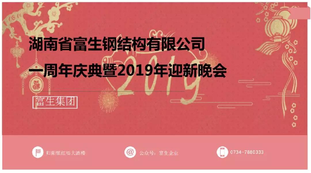 在这辞旧岁、迎新春的美好日子里,富生集团—湖南省富生钢结构有限公司也迎来了一周年庆典暨2019年迎新晚会。宴会现场座无虚席,大家都沉浸在新年即将到来的喜庆氛围中。